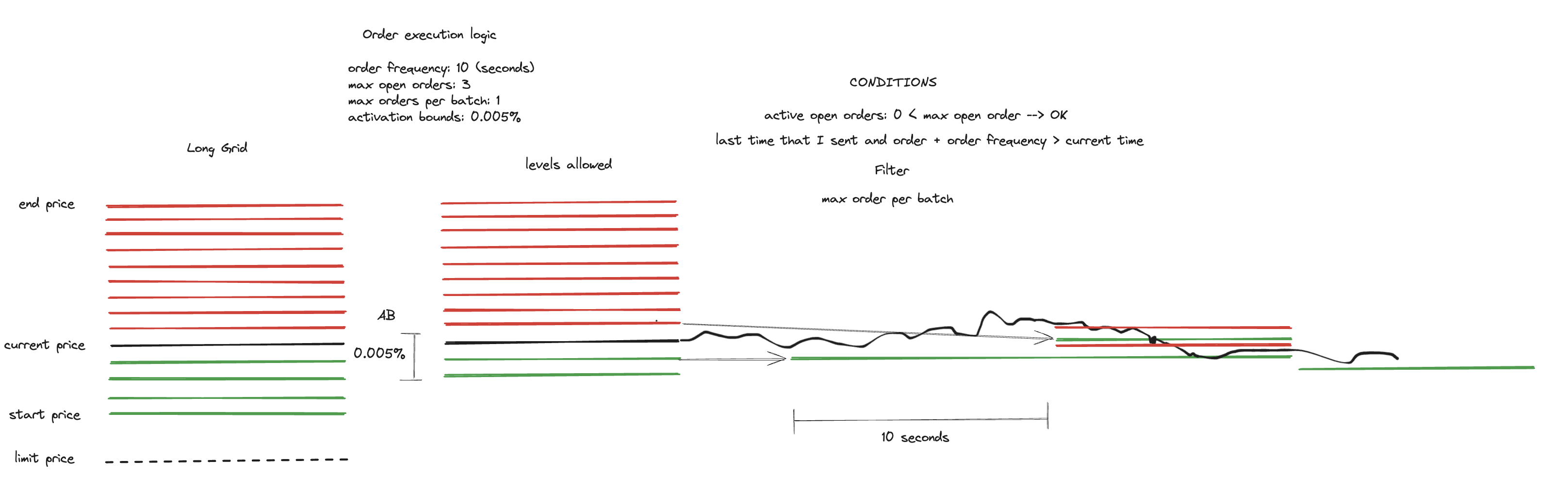 When you start the Grid Strike strategy, it first looks at your configuration to figure out how to set up your trading grid. Once the grid is set up, the strategy begins placing orders based on the set side (buy or sell) within your specified price range. It places order and waits for it to fill. Whenever order_frequency is reached, it checks if it needs to place a new order.