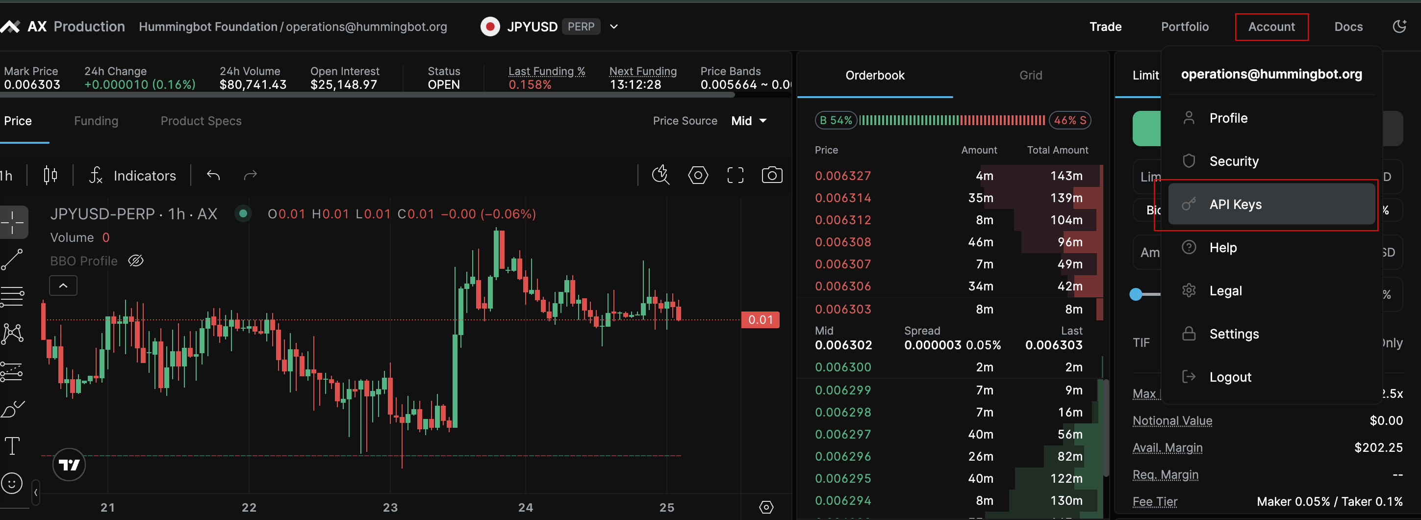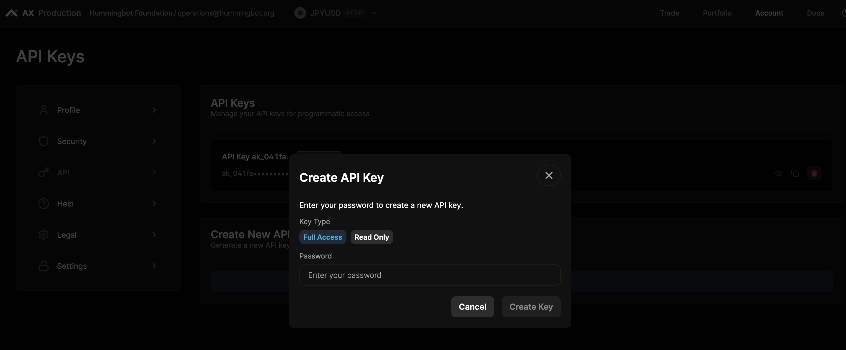 In order to use the Architect Perpetual Hummingbot integration, you will need an API key and secret pair.