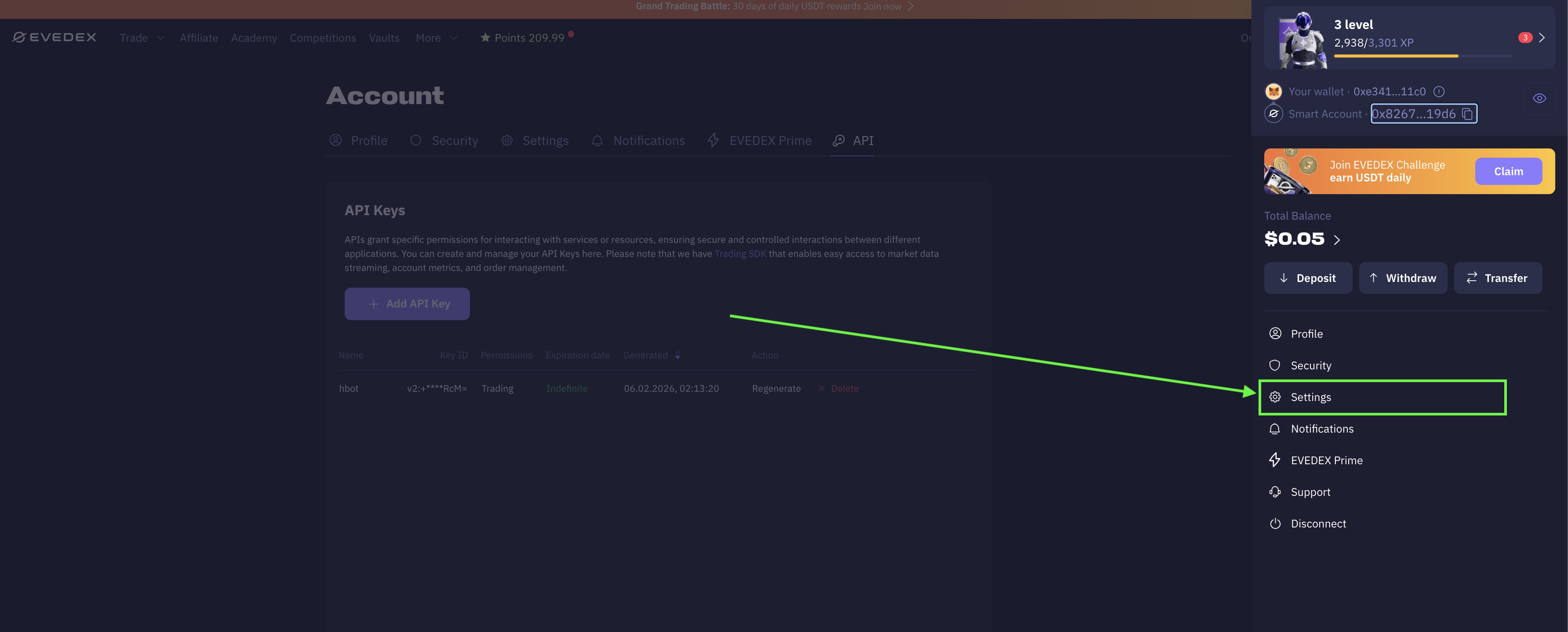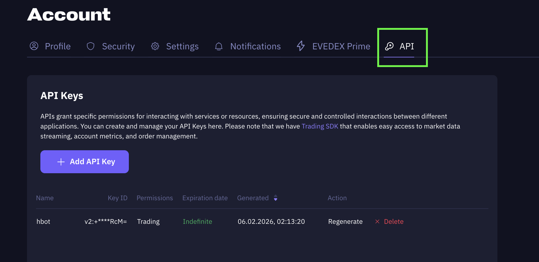 The same API keys on evedex.