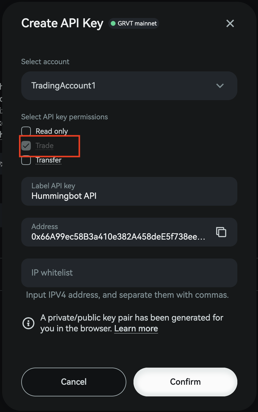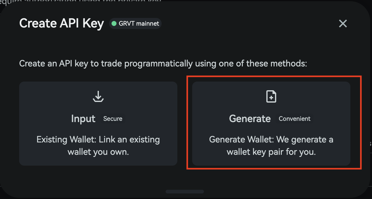 In the creation window, choose Generate so GRVT creates the wallet-key pair for you.