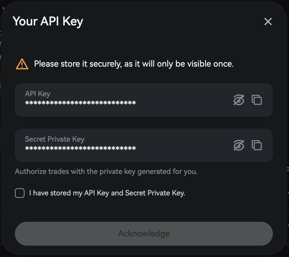 The Secret Private Key is shown only once. Store it securely before closing the window. If you lose it, you will need to create a new API key.