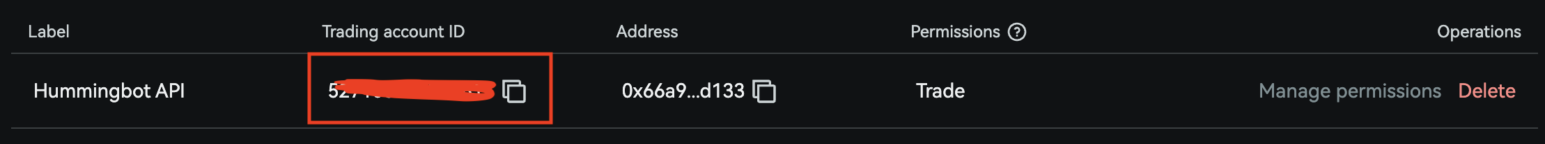 After closing the API key window, copy the Trading ID for the same trading account. This value is also required for authentication in Hummingbot.