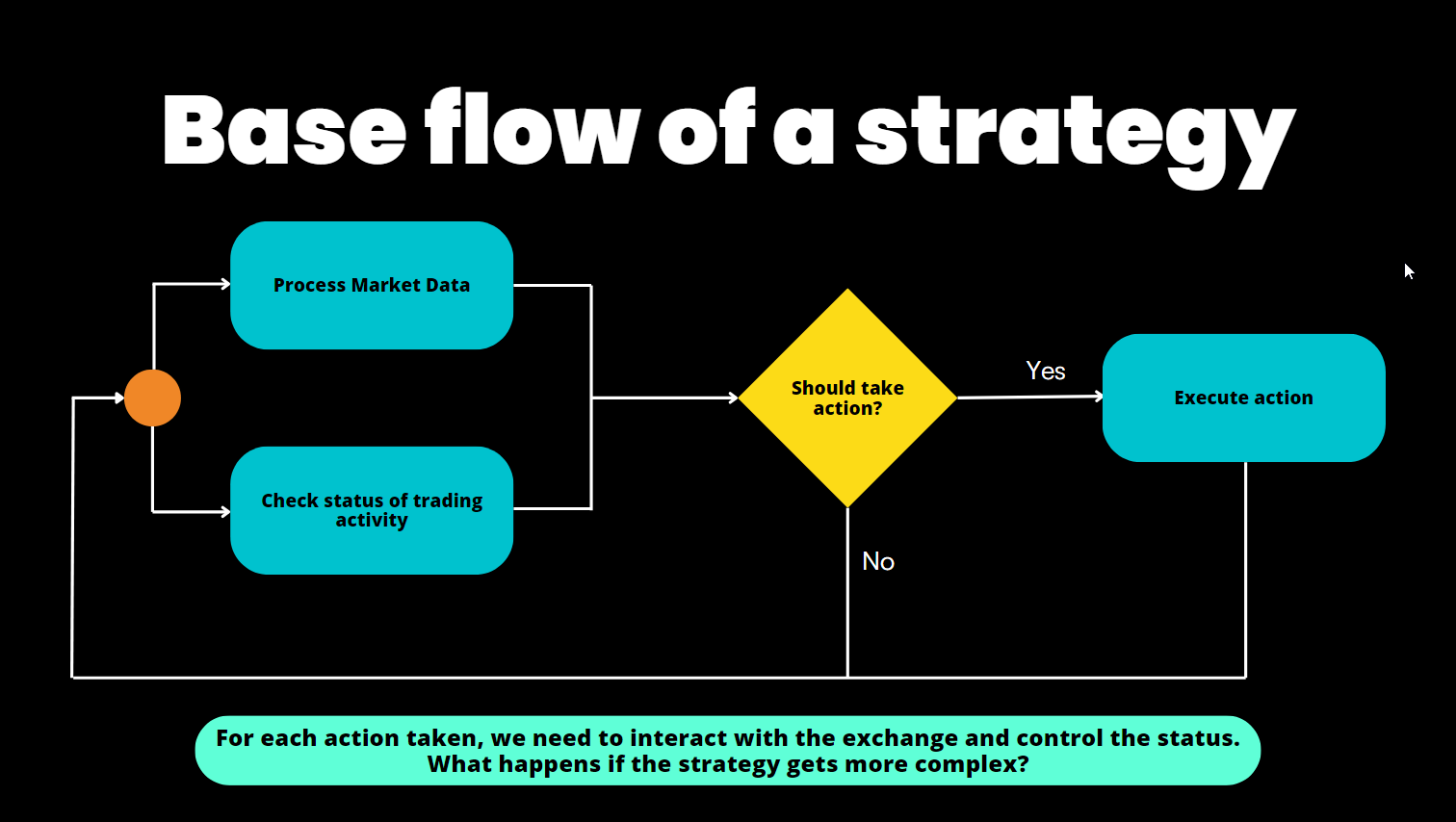 Each clock tick, a strategy loads real-time order book snapshots, user balances, order status and other real-time data from trading pairs on these venues and executes the logic defined in the strategy, parametrized by a pre-defined user configuration.